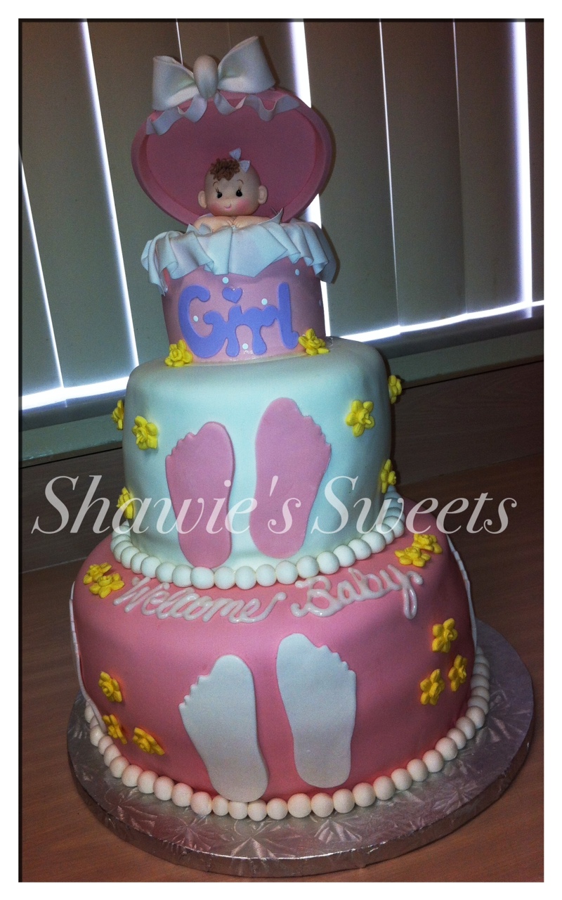 This adorable baby shower cake was made to fit the theme of the shower: baby footprints and yellow daffodils. It is a moist vanilla cake with vanilla buttercream and it is filled with raspberry filling.